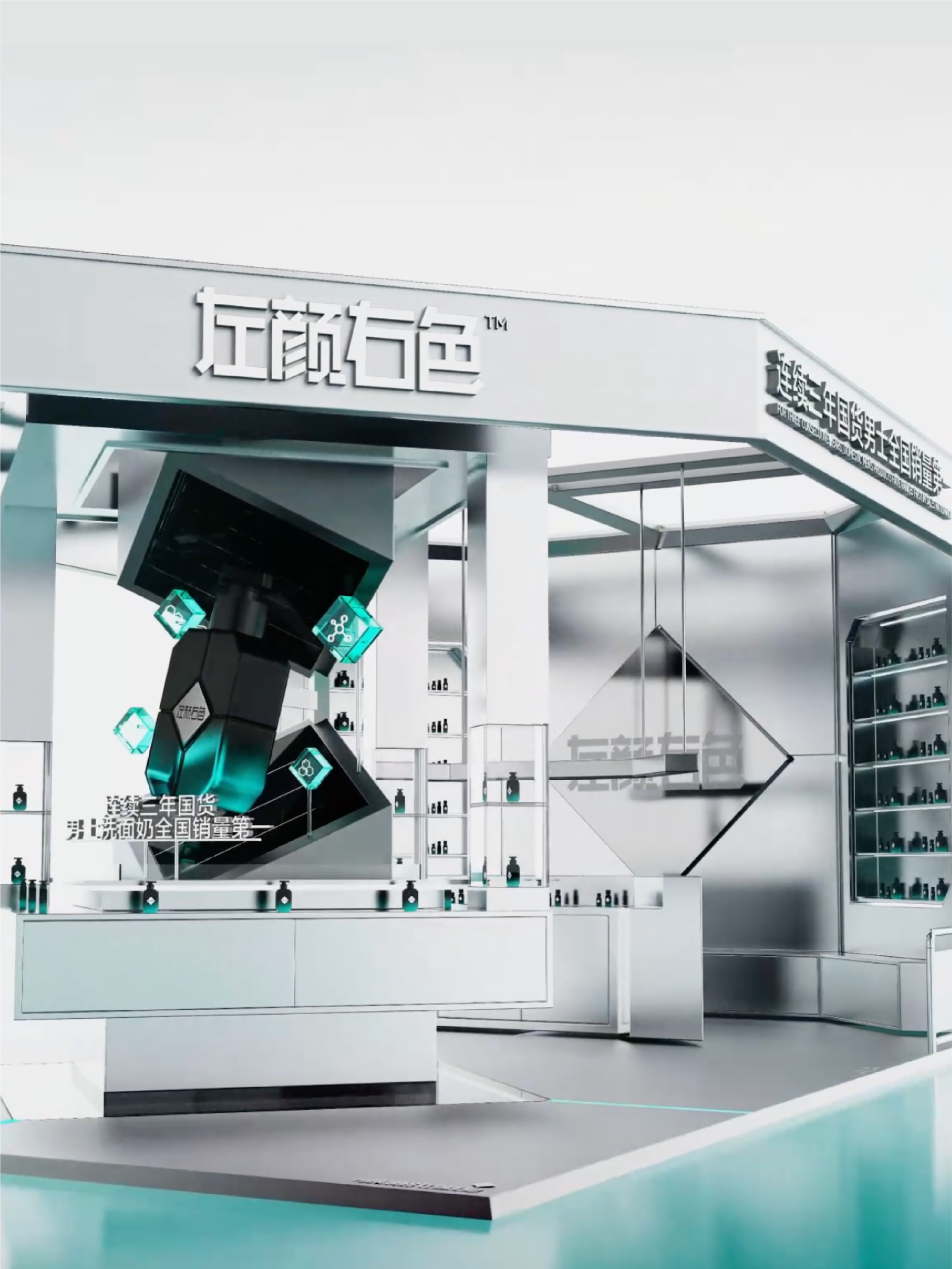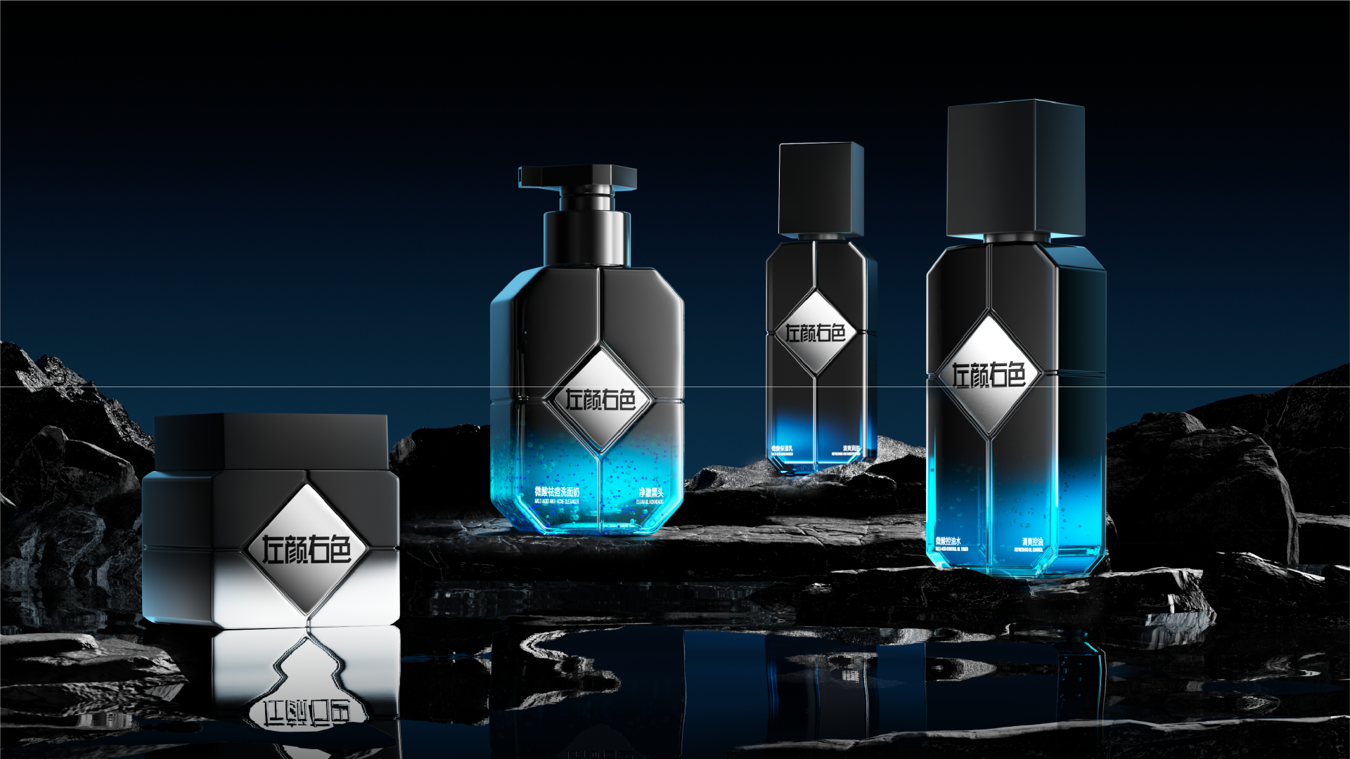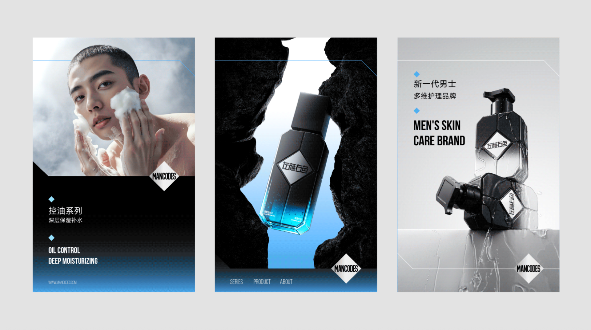 菱形科技重构男性个护空间对话,深度融合工业质感与多维空间逻辑,精准传递左颜右色"专业男性个护“的品牌形象。