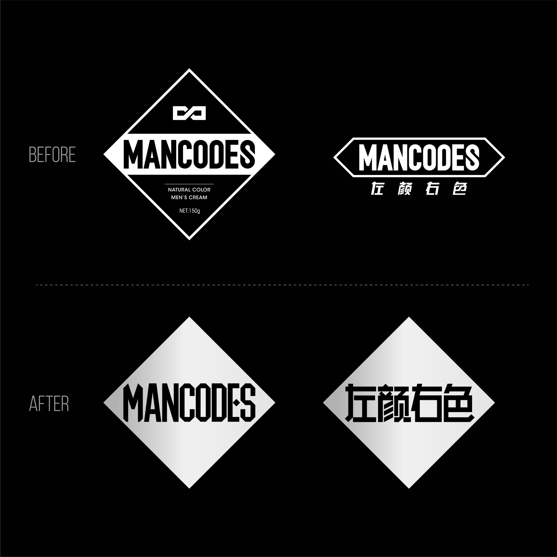 放大从简,去除边框局限压迫感,提升符号占比至80%+,极致强化其原始棱角的视觉张力与力量属性;多维赋能,将菱形从二维图形升维为品牌精神图腾——“保持棱角·方以赋能”,呼应男性理容护肤的“多面需求”。