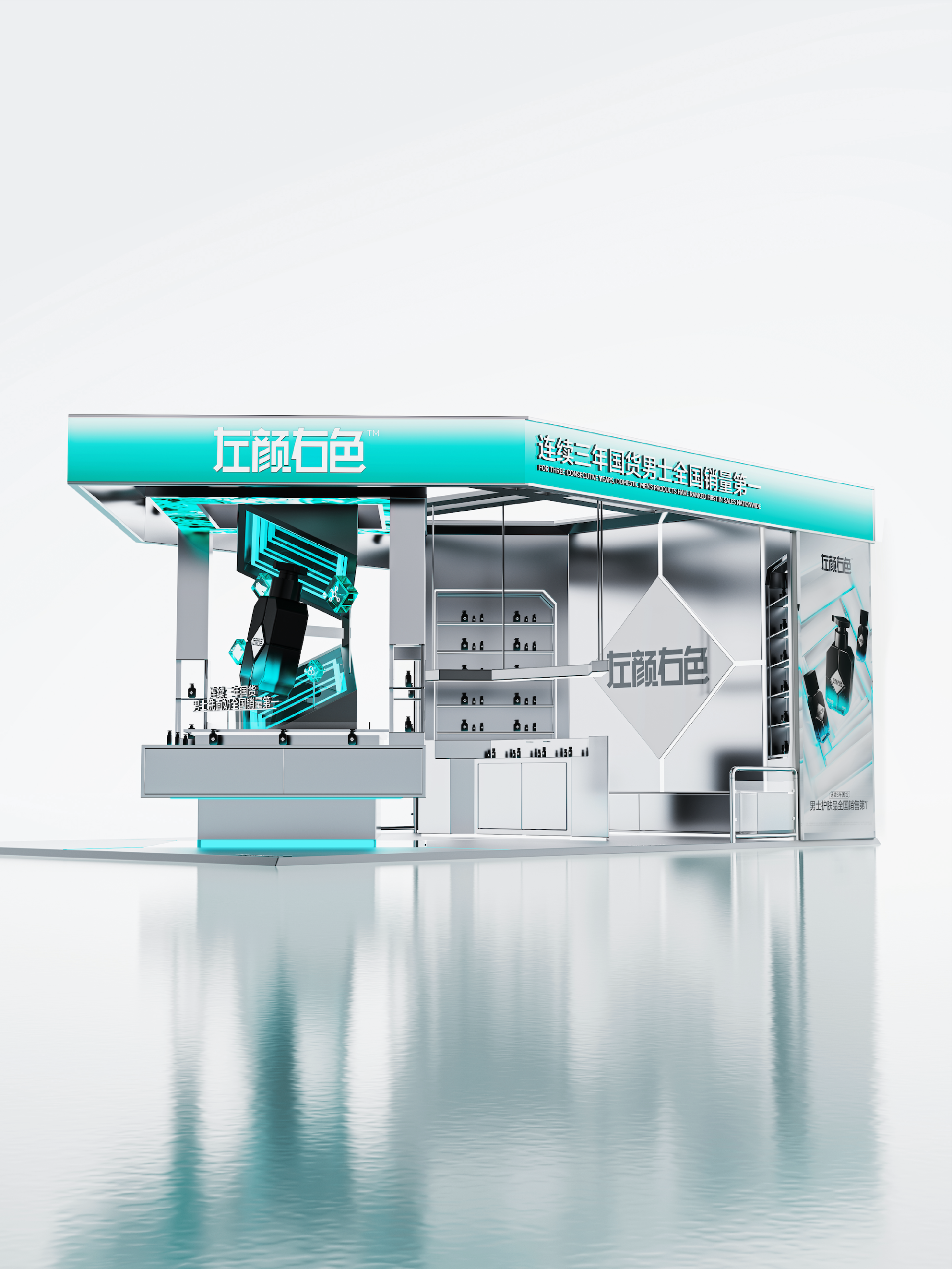 通过冷调材质、层次化灯光与多维动线,在有限展位内实现品牌辨识度、空间效率与用户体验的三重突破,构建出兼具专业度与记忆点的男性个护品牌空间场域。